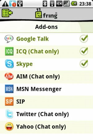 Fring – мультипротокольный мессенджер для андроида, благодаря клиенту Fring вы можете общаться со всеми своими друзьями в самых популярных сервисах, таких как: ICQ, Skype, Google Talk, MSN, Twitter и другие.
